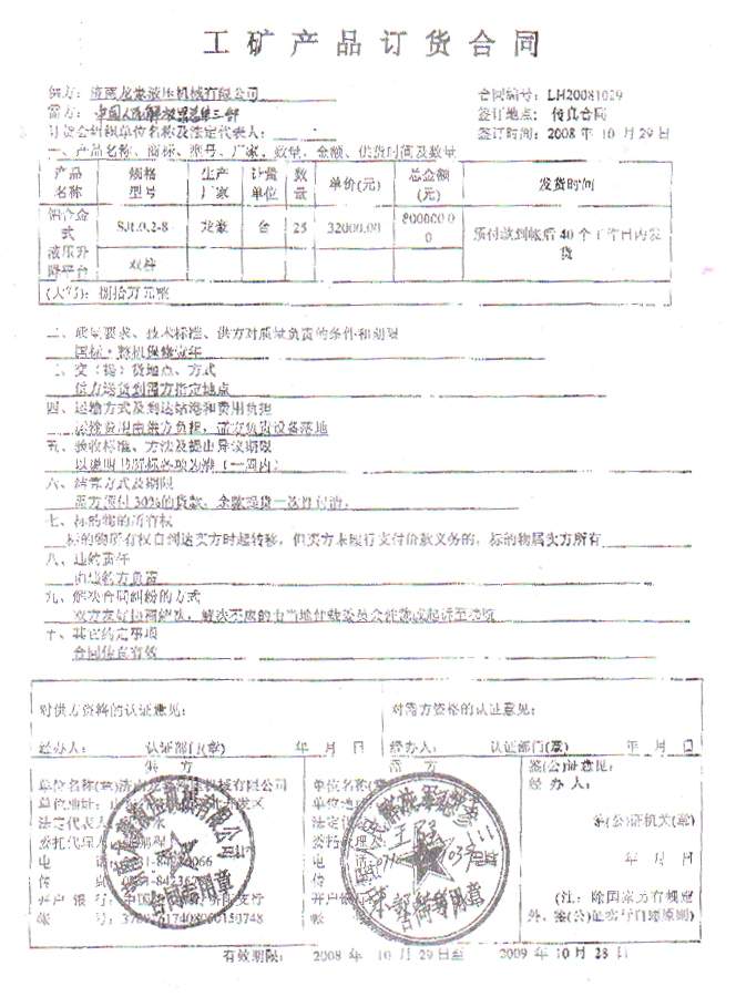 2008年10月28日中國人民解放軍總參三部物資處3名解放軍干部來(lái)我公司實(shí)地考察??疾毂容^后對我公司的規模和產(chǎn)品給予了極大的肯定,并就一直聯(lián)系的要購買(mǎi)的25臺鋁合金升降機簽訂了訂貨合同?,F我公司已按照約定如期交貨,總參三部驗收后非常滿(mǎn)意,并已全部付款到位。